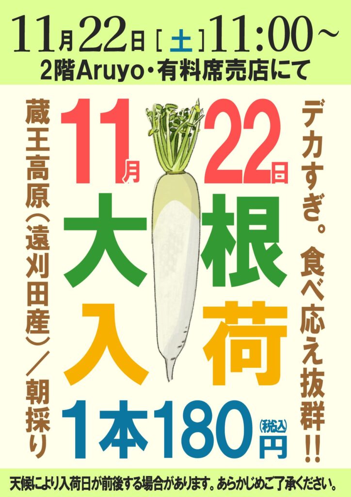 11月22日(土)、蔵王町遠刈田温泉七日原産の大根が入荷予定。