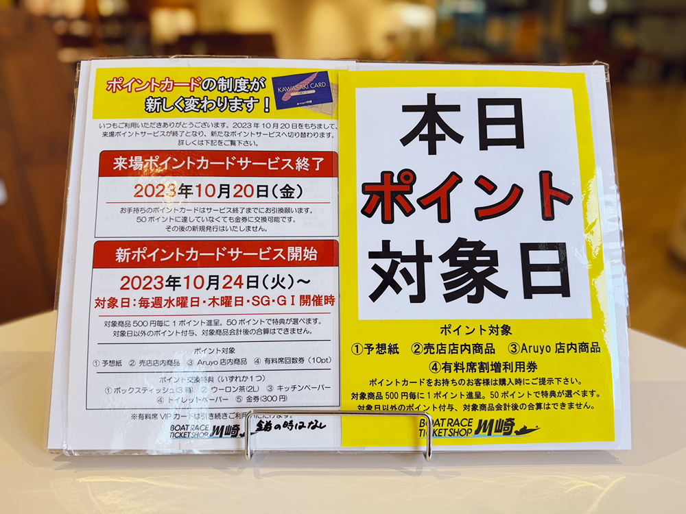 ポイント対象:㈰予想紙 ㈪Aruyo店内商品 ㈫1階有料席売店店内商品 ㈬有料席回数券