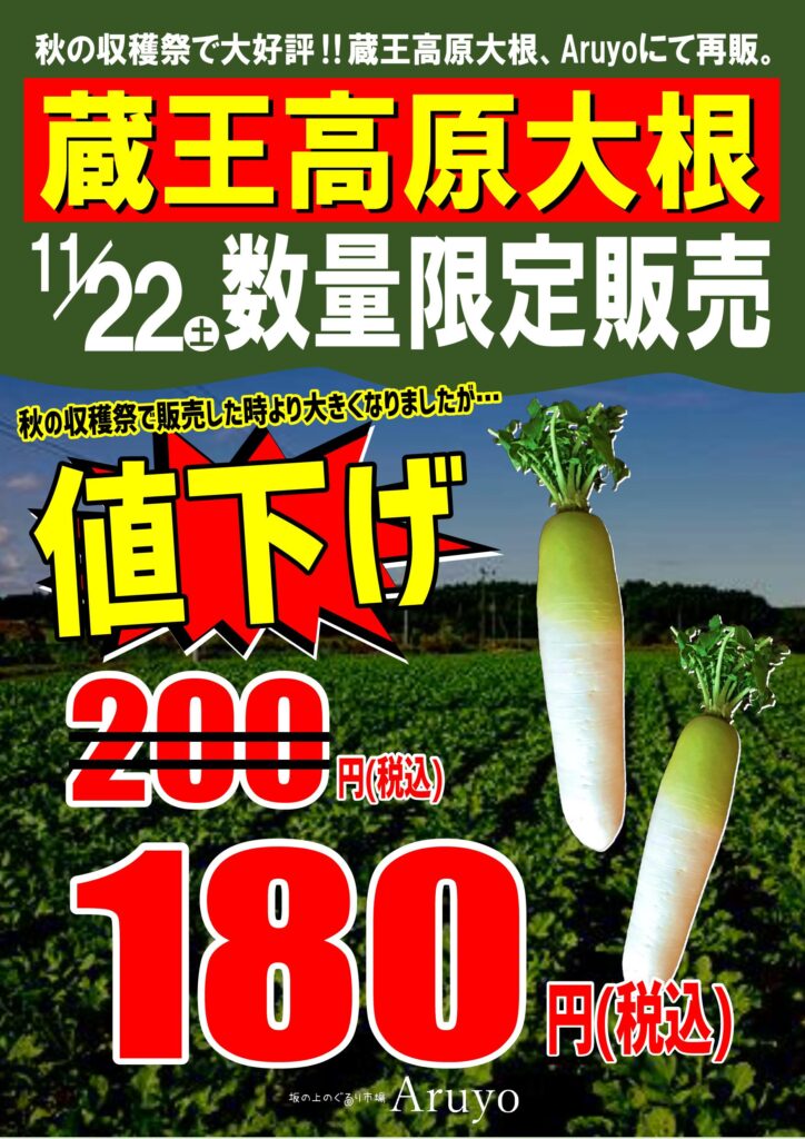 明日、11月22日(月) は蔵王高原大根を販売いたします。